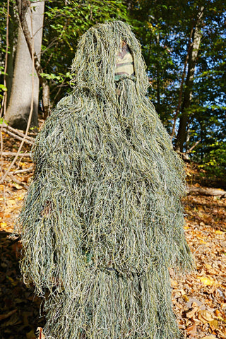 A ghillie suit is a camouflage suit clothing designed to blend with the environment. It is made of garment in strips of burlap and cloth to look like leaves, grass, trees or snow. The camo suits are typically worn by hunters, snipers, wildlife photographer, paintballers and birdwatchers to conceal themselves from targets.