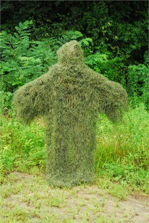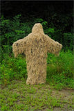The Synthetic thread is hand tied to our Nylon netting. Netting has 1"x1" squares, and a tensile strength of 500 lbs. The Synthetic thread has 10-12 Lbs of tensile strength per strand. 4-5 strands of thread are attached to every knot. Has separate sleeves to put your arms through, and an attached hood. The front is open for those of you who like to crawl on your stomach, and can be easily converted to your favorite BDU's for a super sniper suit. Directions for the sniper suit can be found on our "How to Build" section listed on the left. The inexpensive Sniper suit!