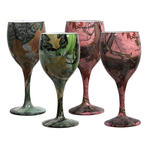 8 ounce wine glasses. What would be a better compliment to any outdoor or hunting enthusiasts decor than a selection of camouflage glassware. These real glasses are Hydro-graphically printed in regular and Pink Fall Transition Camo by CB Outdoor and look awesome! All are dishwasher safe and come in great looking protective, full color window boxes.
