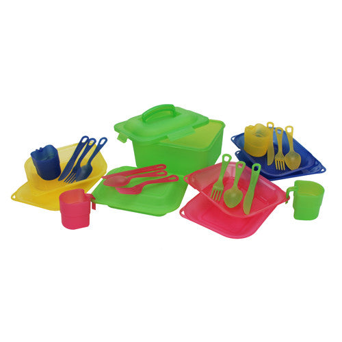 - All tableware stores back in large container which can also be used as a mixing bowl