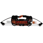 The 25 pound Banshee Quad Compound Set features an all soft touch grip, an ambidextrous reinforced handle and is offered in an eye catching color for the beginner. The set includes 2 target arrows, finger rollers, and an adjustable sight.