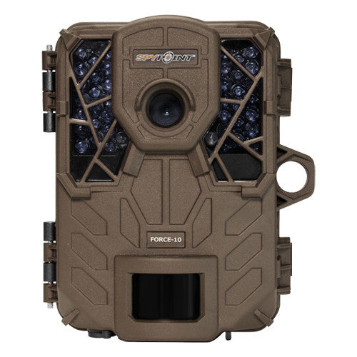 The ultra-compact SPYPOINT FORCE-10 trail camera captures 10 megapixel photos or HD video in color by day & black-and-white by night. The camera uses 42 high-power low-glow LEDs to offer the best night time images. It is the perfect camera to avoid disturbing or spooking your game. The curved motion sensor lens improves the detection angle and distance of its 5 detection zones. The detection range can also be adjusted from 5' to 80'. The camera has an incredible battery life when powered by 6 AA batteries and even longer when using the rechargeable lithium battery pack (sold separately).