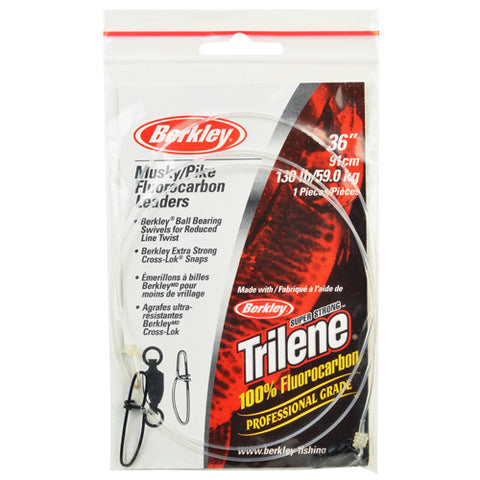 Musky/Pike Fluorocarbon Leader, made with Berkley Trilene 100% Fluorocarbon to resist bite-offs and provide ultimate impact strength. Hand-tied and glued for increased reliability. The Berkley ball bearing swivels for reduced line twist.