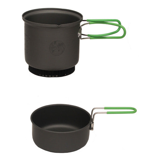 Highly versatile and efficient 2-piece hard anodized aluminum cook set. The special heat exchanger reduces "time to boil" by 20%, making your stove energy efficient and saving fuel when cooking. Set includes: 0.95 L Heat Exchange saucepan with pouring lip and measuring marks (ml and oz), fry pan that doubles as a lid, and mesh storage bag.