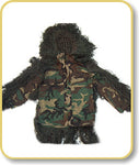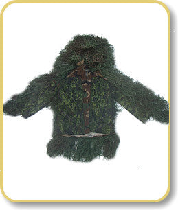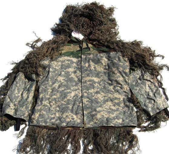 Sniper Jacket Our Same High Quality Jute Thread is sewn directly on to a Military BDU 4 pocket coat. The sewn on Jute thread covers the entire Back of the jacket, tops of the arms, and shoulders. The Hood is attached, and thumb loops are sewn into the cuff of the sleeves for crawling.