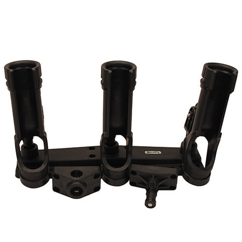 Scotty #256 Triple Rod Holder includes three #230 Power Lock rod holders, and a post bracket. Scotty's fully adjustable multiple rod holder comes with a built-in lure and accessory rack, which gives you quick access to your lures and tools. The Power Lock rod holders are Scotty's most popular, value-priced, positive-locking, open style rod holders. Made from fiber reinforced engineering nylon, offering strength, resilience and reliability. Like all Scotty post mount rod holders, they adjust up and down and rotate 360 degrees. Bolting dimensions are 1 5/16" x 3 3/16".
